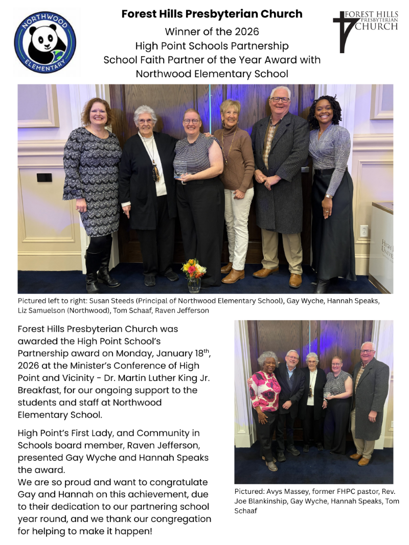 Forest Hills Presbyterian Church and our members have been involved with Mobile Meals of High Point for over 25 years, delivering meals for elderly and disabled clients, and several members have served on the Mobile Meals Board in numerous capacities. Additionally through the Mission Committee, we have assisted Mobile Meals financially.